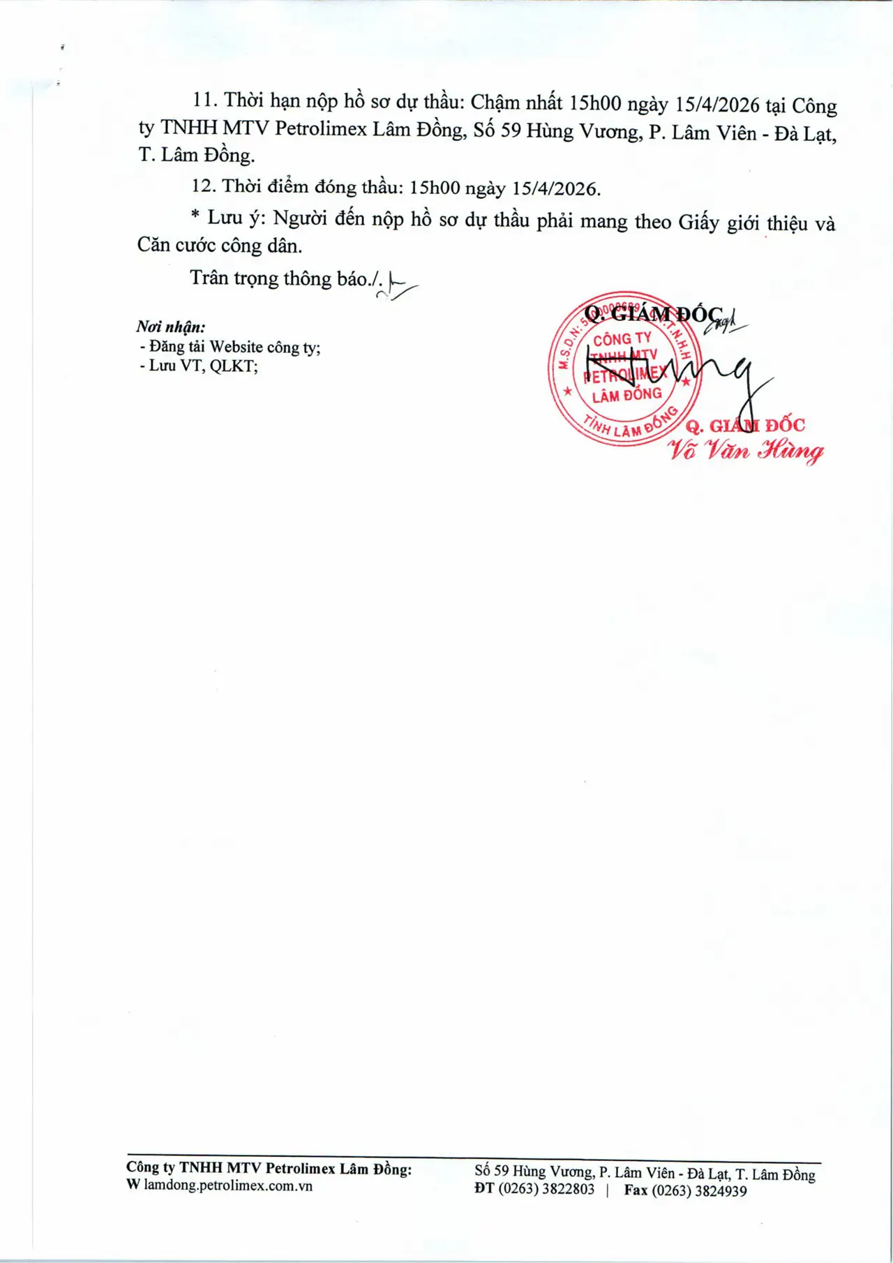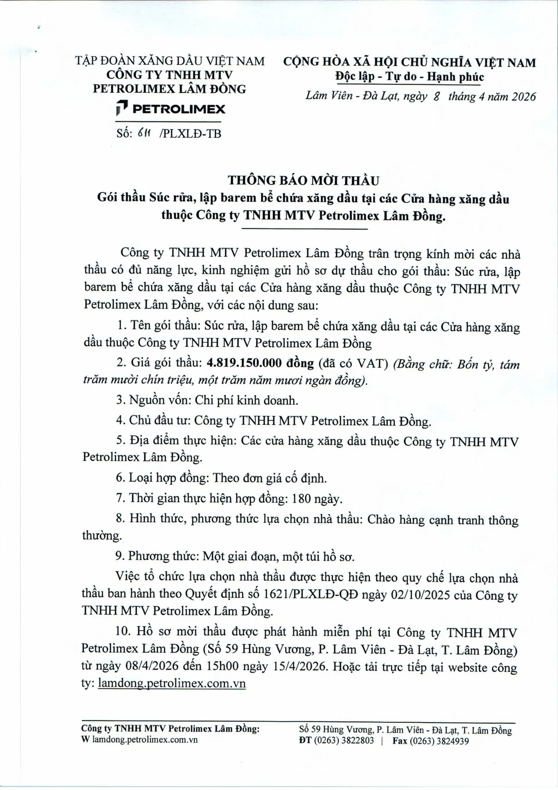 Thông báo mời thầu: Gói thầu súc rửa, lập barem bể chứa xăng dầu các CHXD thuộc Công ty TNHH MTV Petrolimex Lâm Đồng